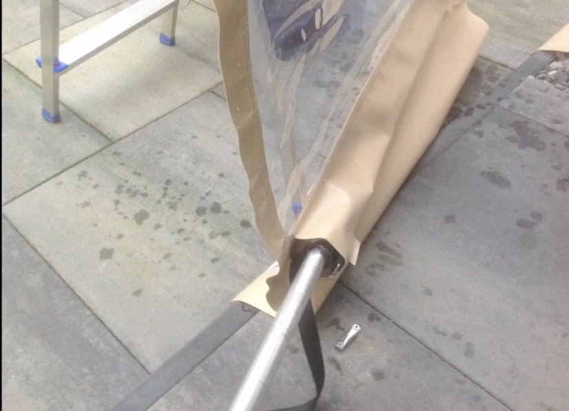 Da der ikke er plads til at skubbe sejlet ind, saver du en lille del væk af den øverste skinne, så der i midten opstår en indføringsåbning på ca. 10 cm.